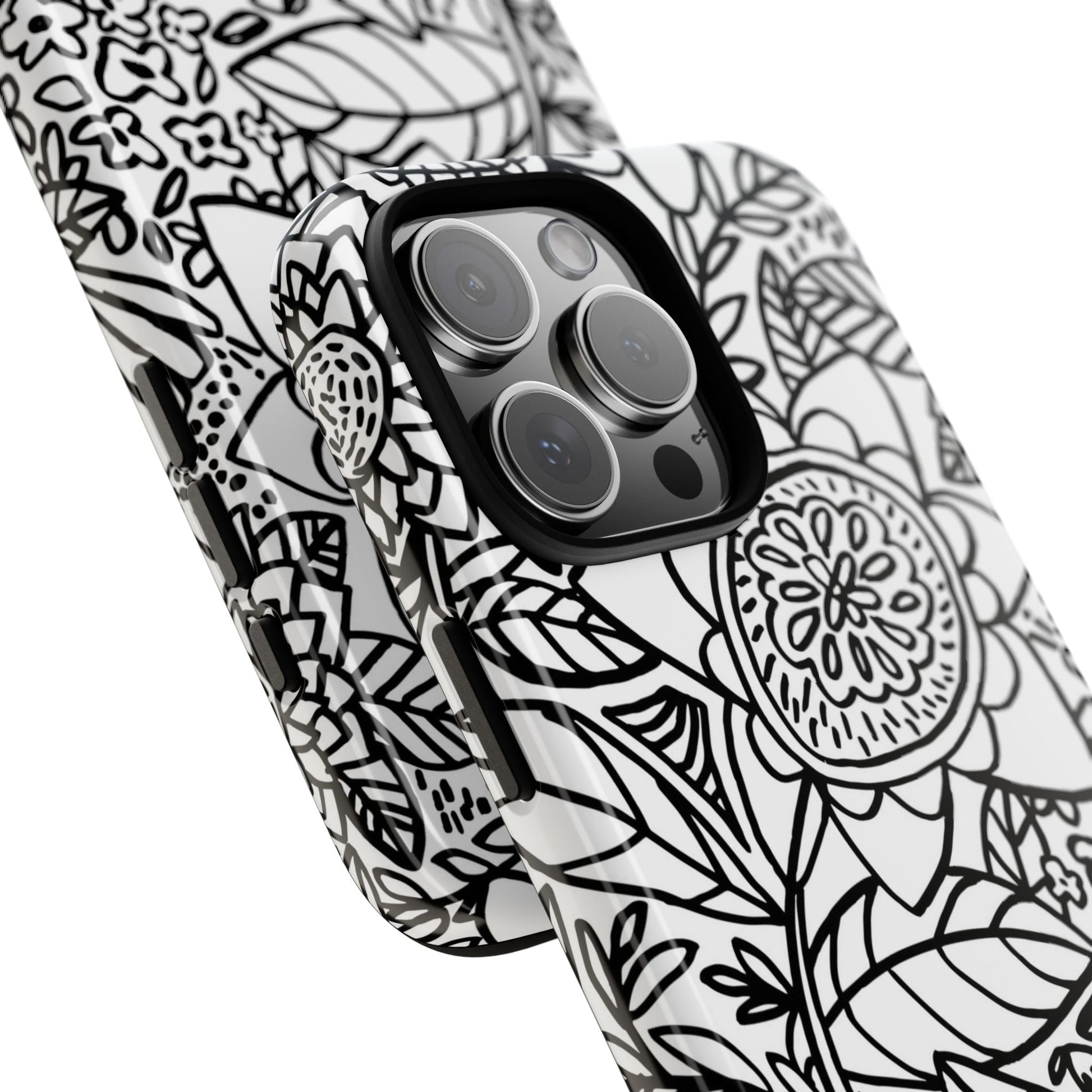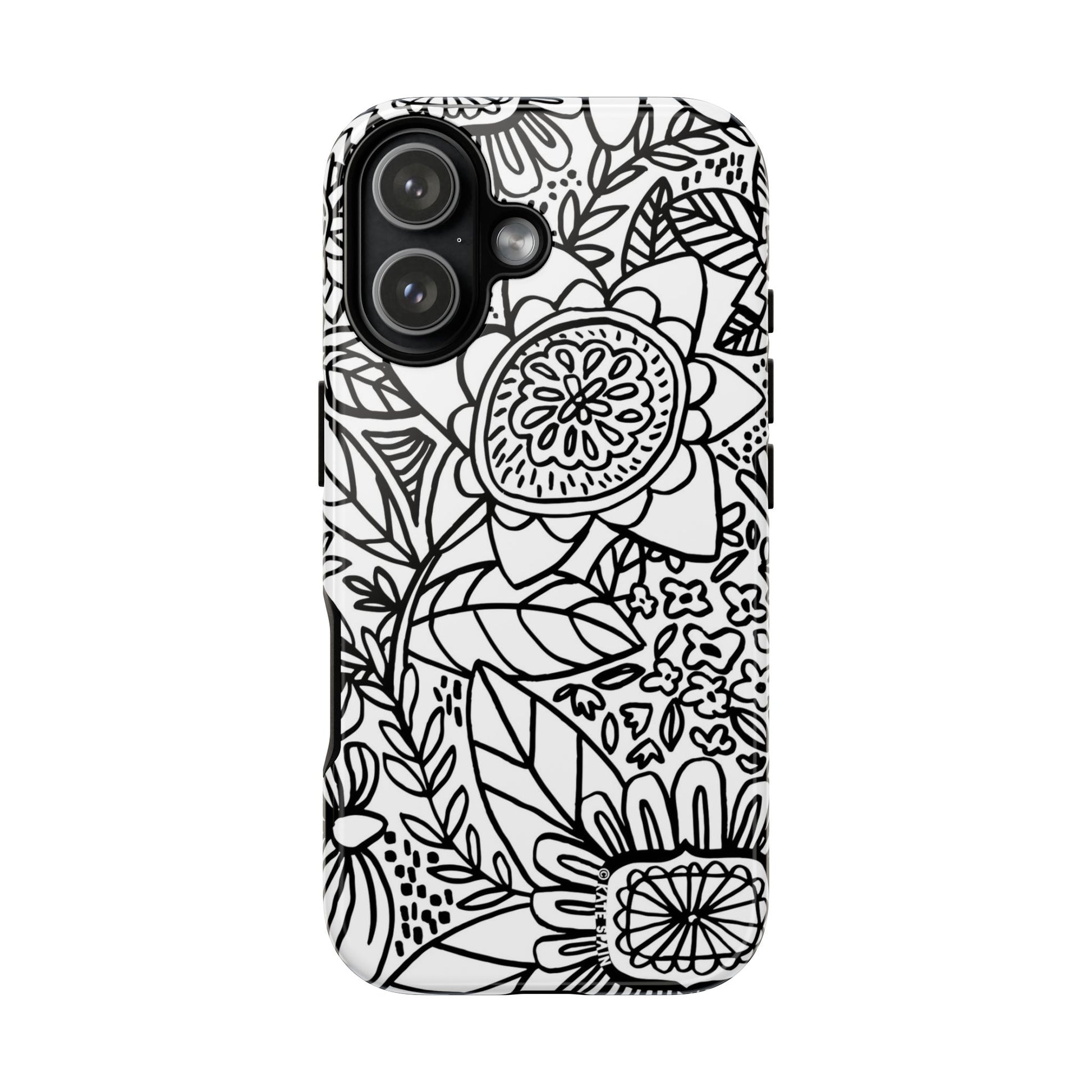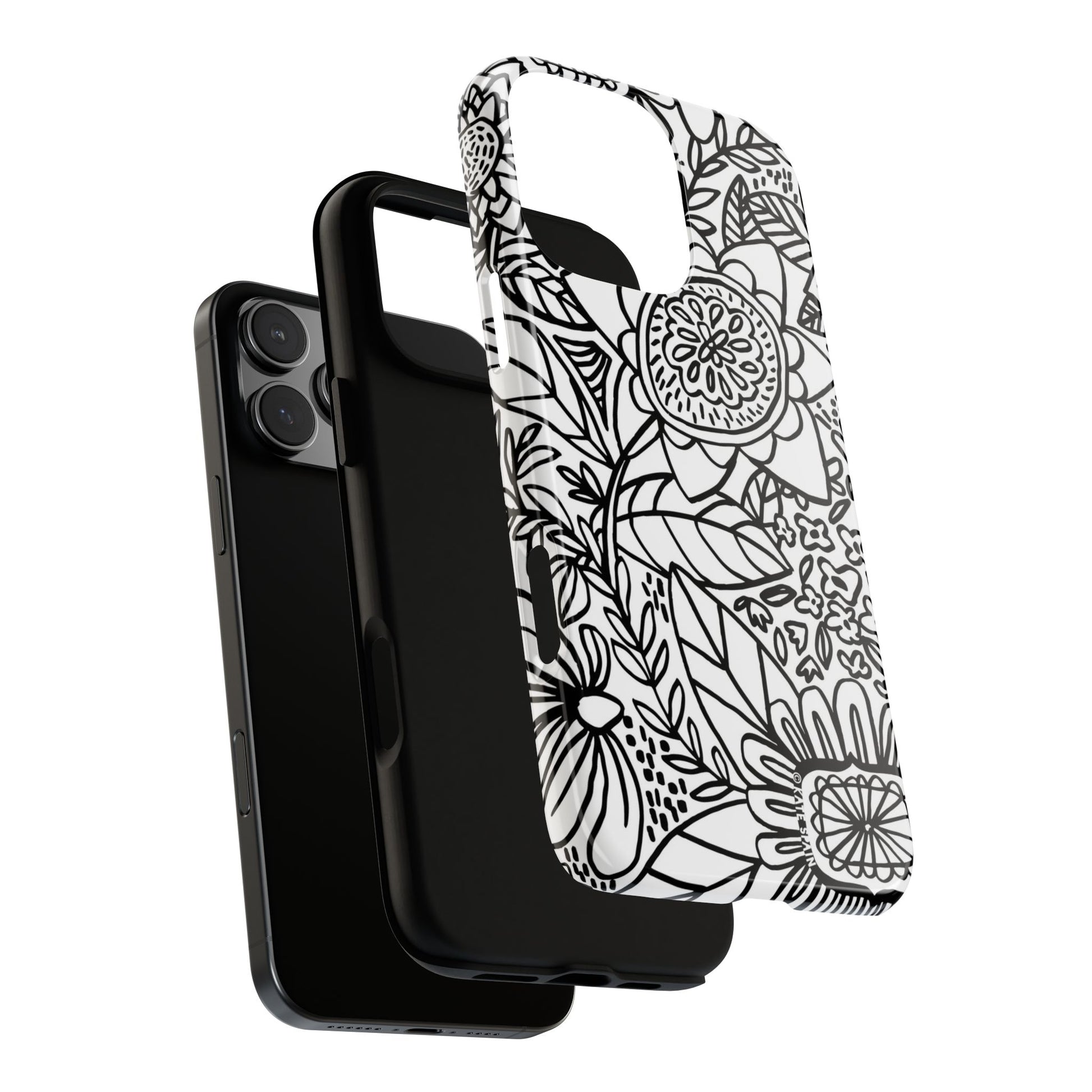 The Esprit iPhone Tough Case features a minimalist design of hand-drawn flower doodles, showcasing simple line drawings in classic black and white.