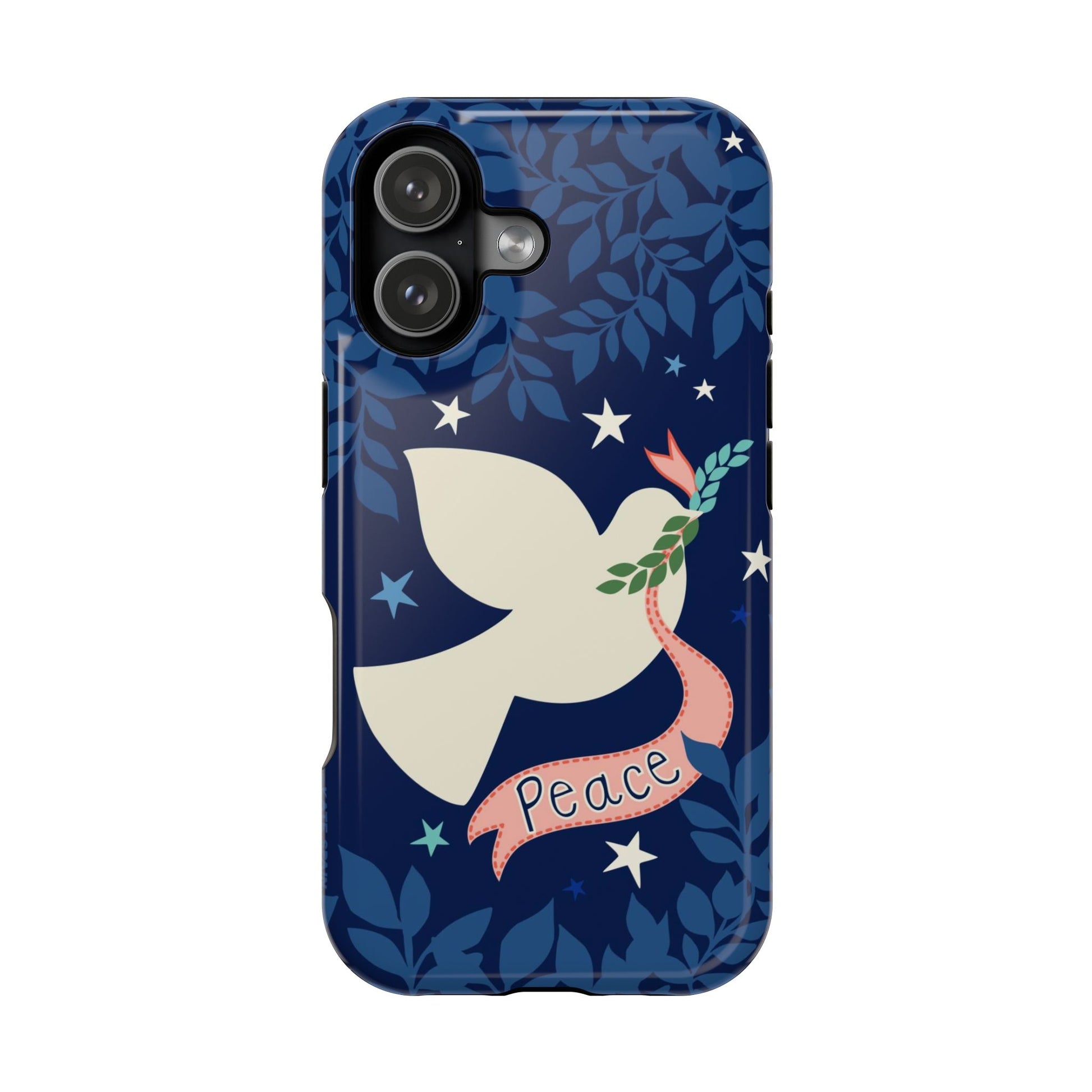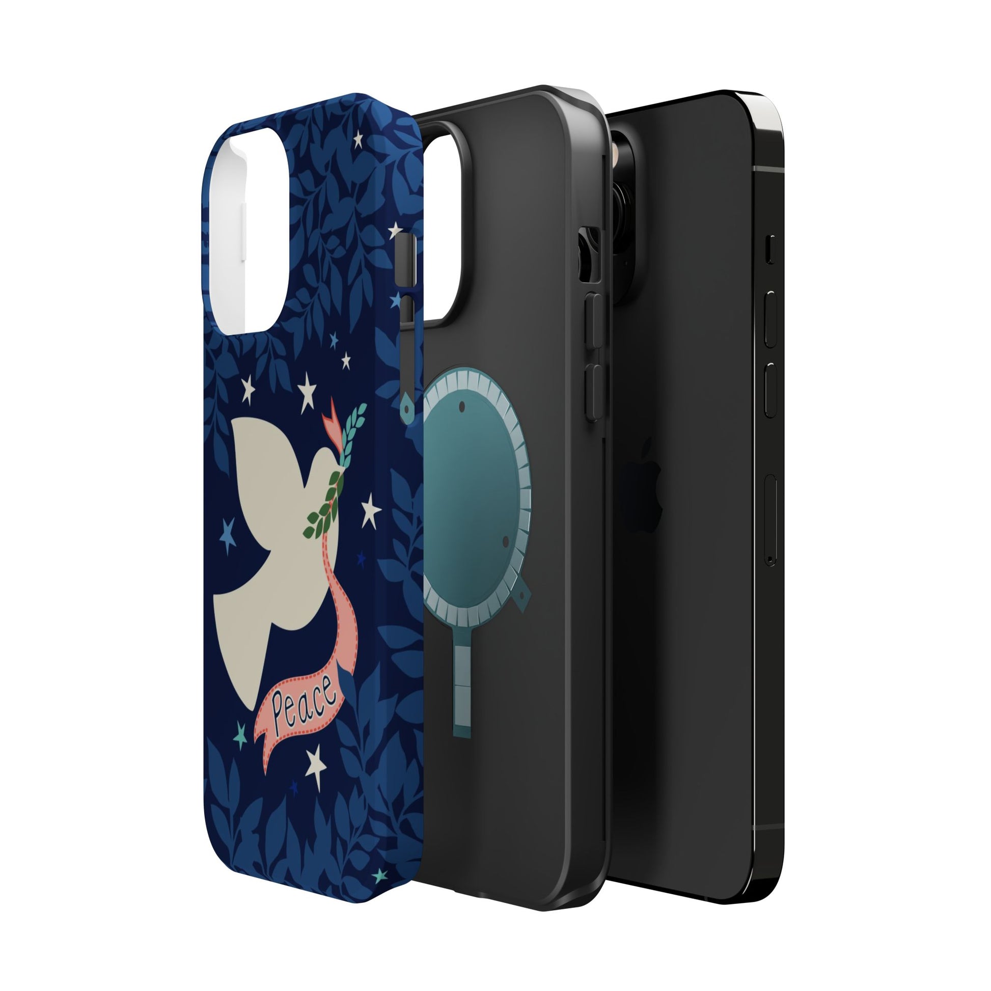 The peaceful message of the Christmas season is conveyed by a winter dove against a starry night sky. Protect your MagSafe iPhone in this serene tough case.