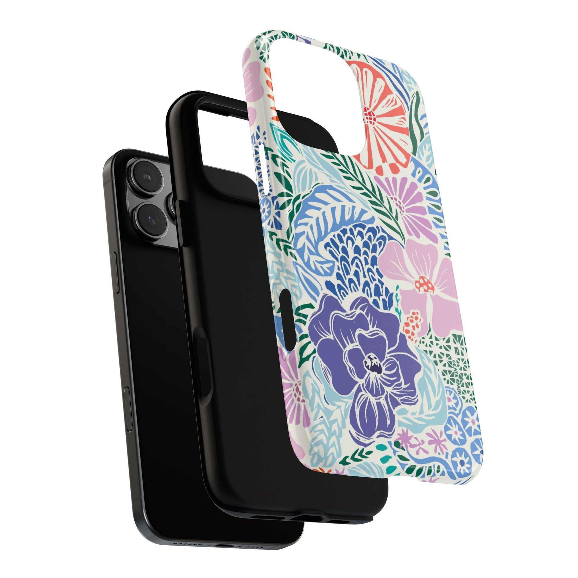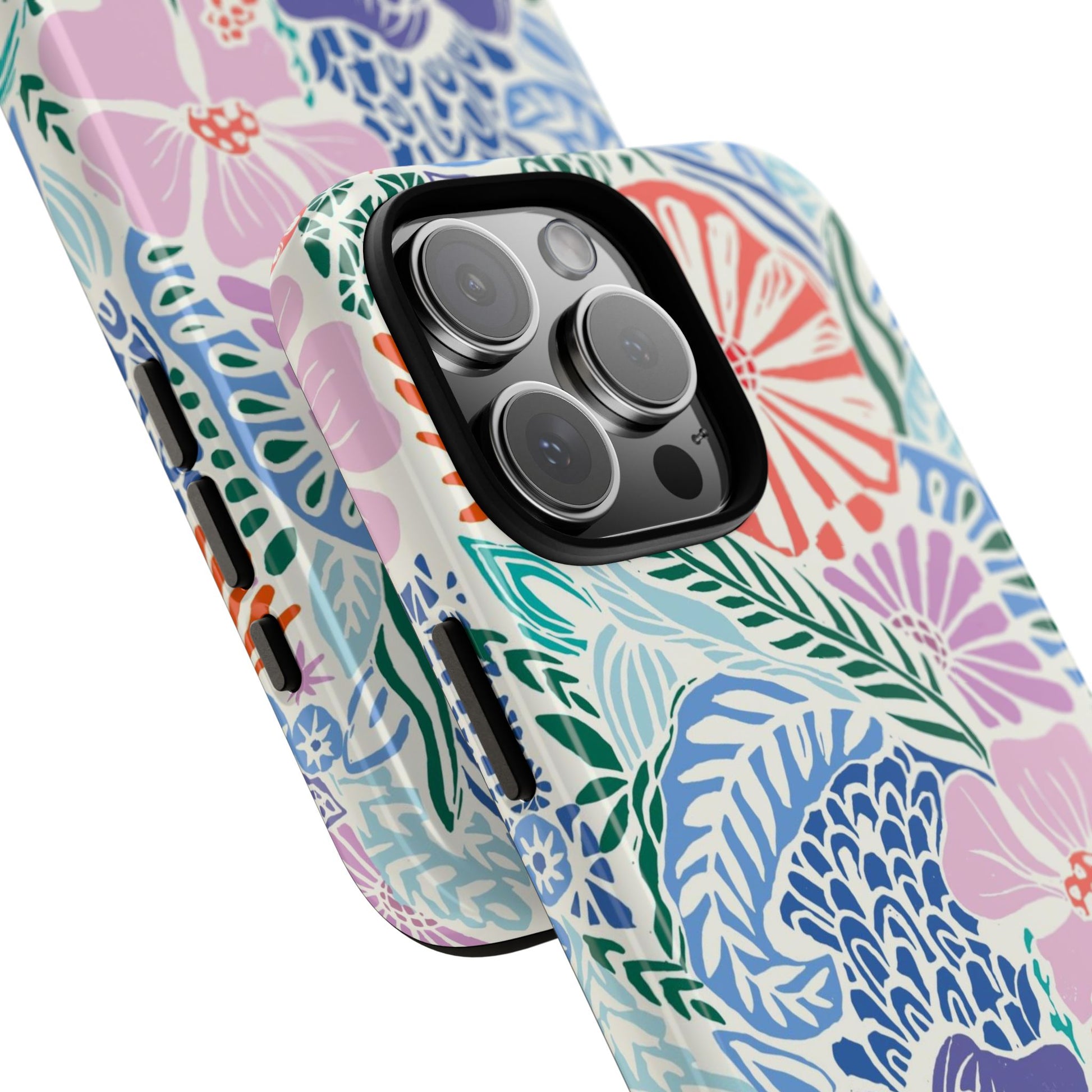 Uniquely designed iPhone tough case with a hand-carved woodblock print showcasing a vibrant and detailed flower design.