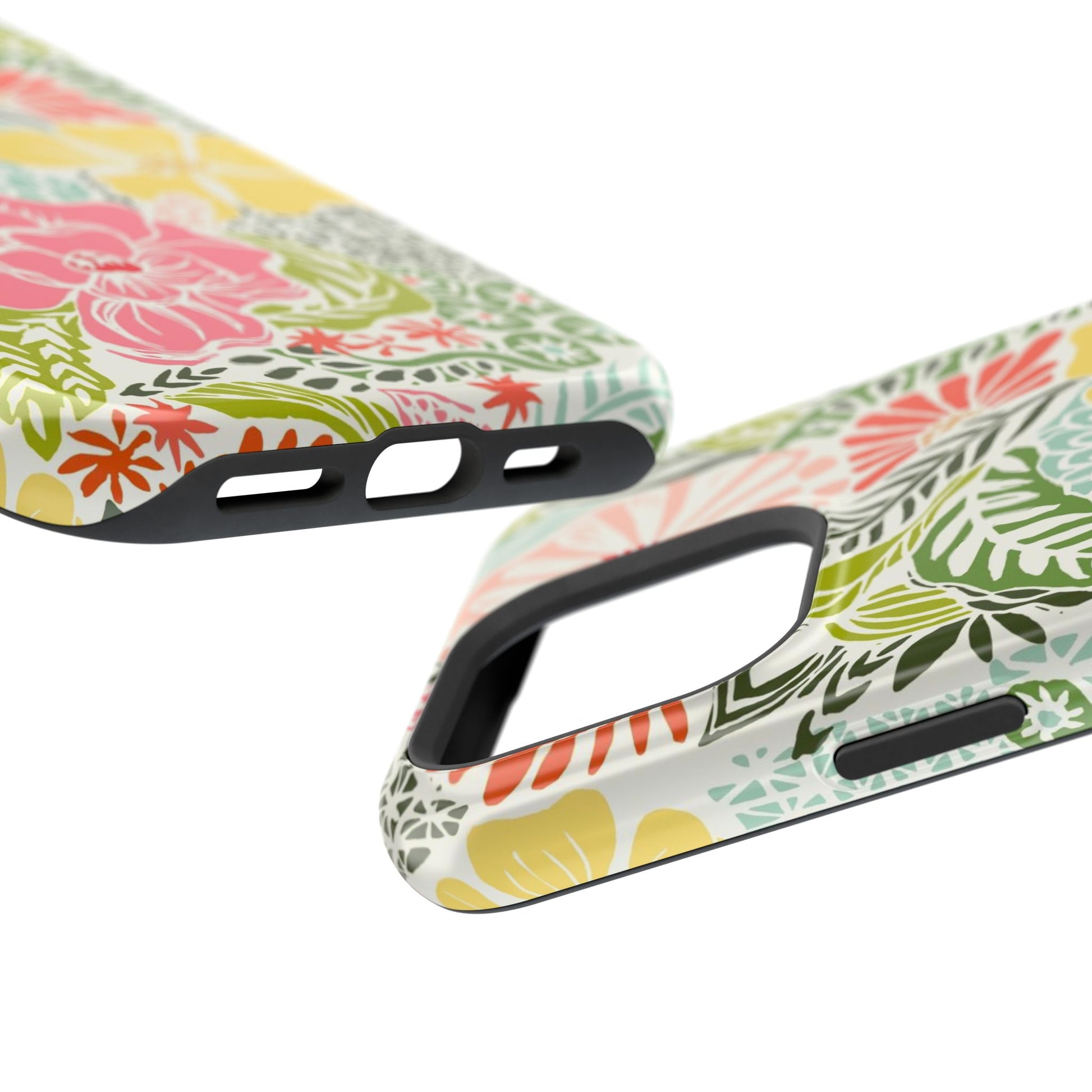 Uniquely designed iPhone tough case with a hand-carved woodblock print showcasing a vibrant and detailed flower design. MagSafe charging compatible.